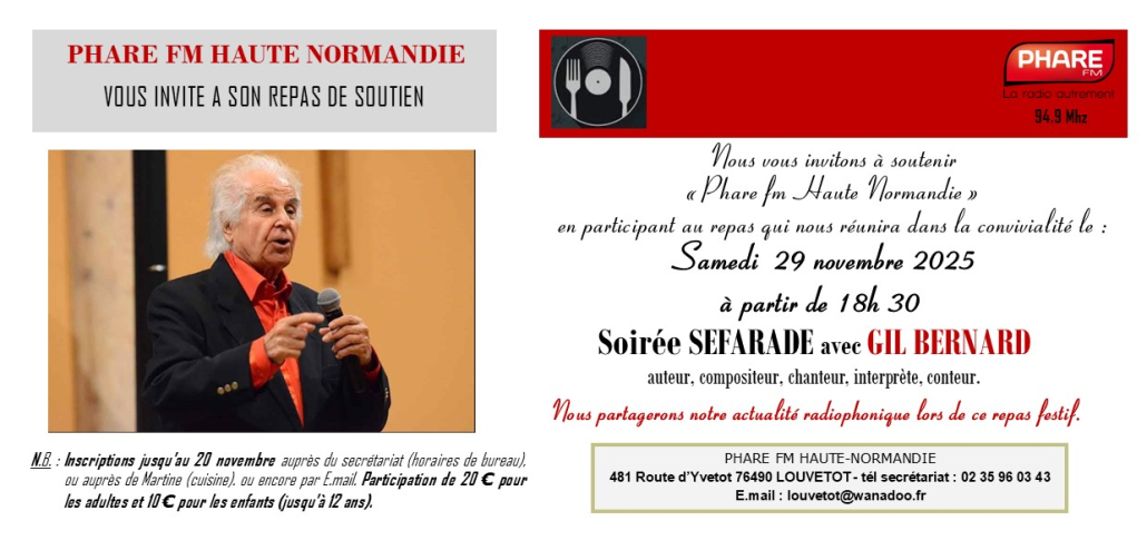 REPAS DE SOUTIEN PHARE FM HAUTE NORMANDIE Samedi 29 novembre 2025 à 18h 30